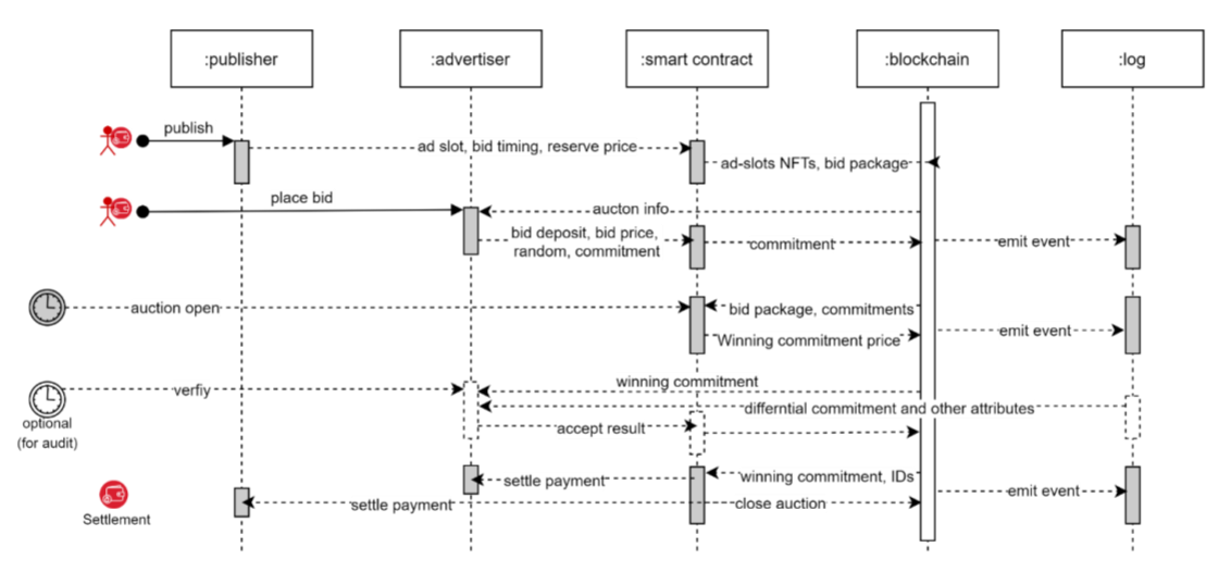 The auction process consists of the following different stages: publish, bid, open, verify and settle. Overall, there are four actors: publishers, advertisers, the smart contract and the blockchain. Firstly, the owner of content platforms publishes the available advertisement slots on the blockchain, and advertisers then submit their bids before the deadline. The interaction between the various actors during the auction process is depicted in Figure 8, which are supported at various stages by the smart contract functions.